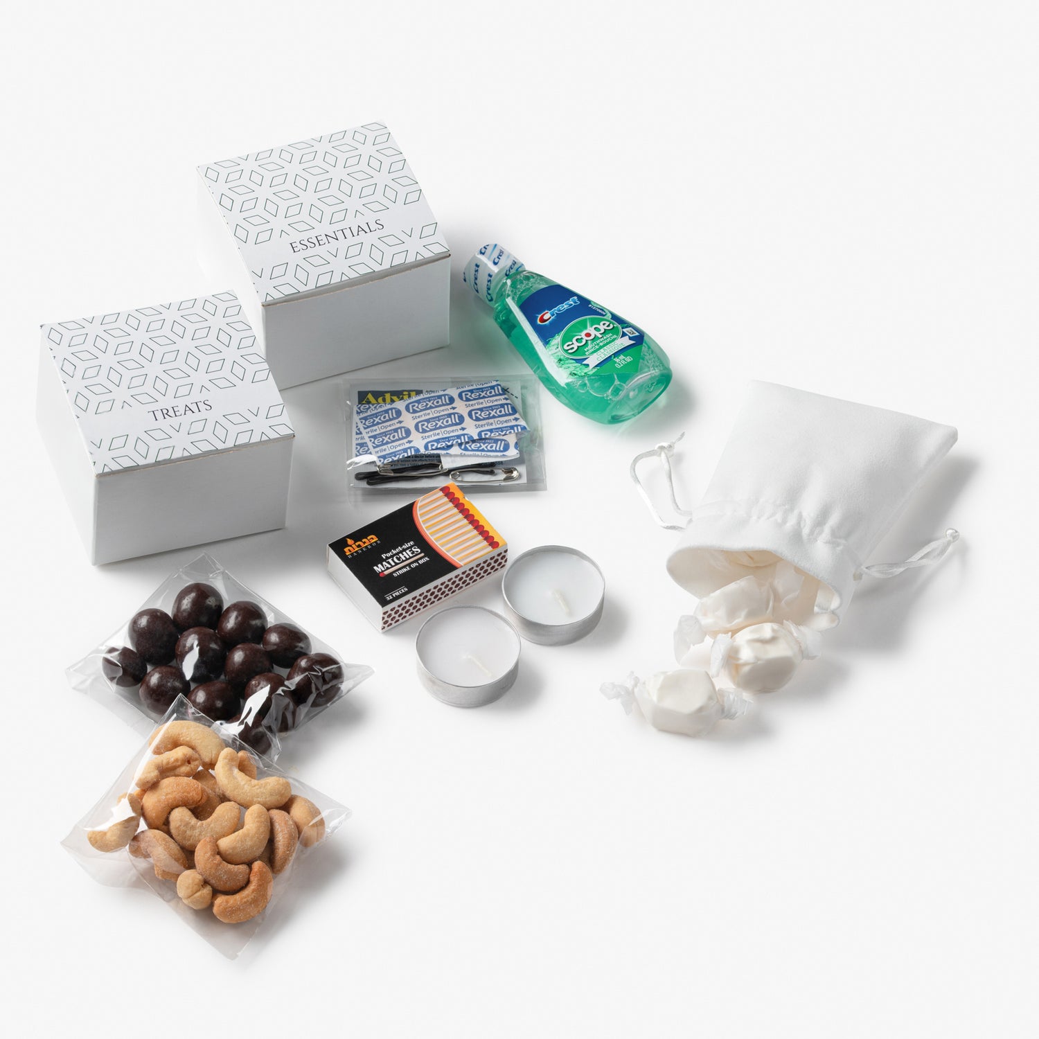 - 6 Amenities: Advil, mouthwash, bandaids, safety pins, pony holders, tealights & matches
