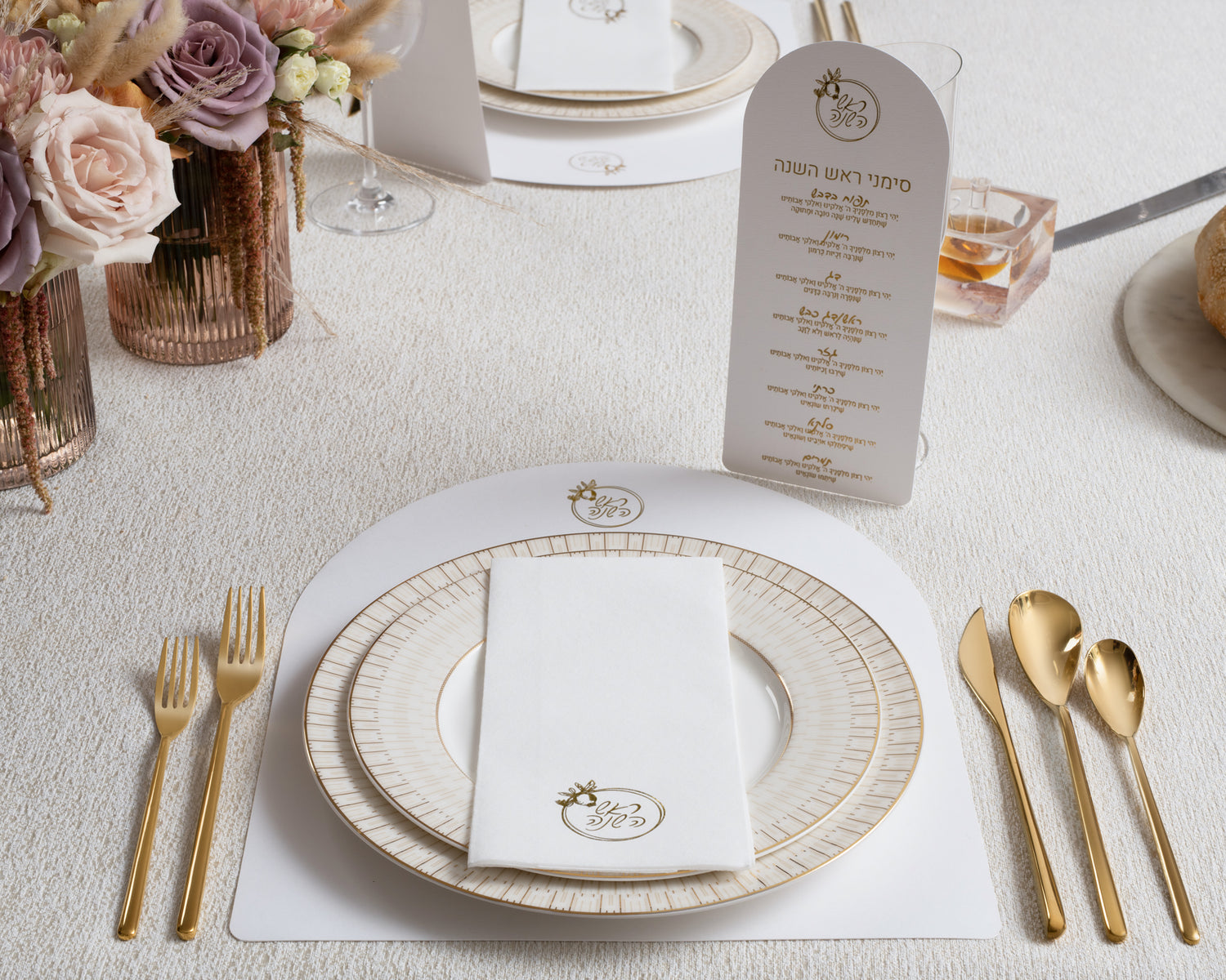 Coordinating set of Chargers & Simanim Cards, in a line textured cardstock with a dome shape in a choice of gold & silver metallic or black foil stamp logo.