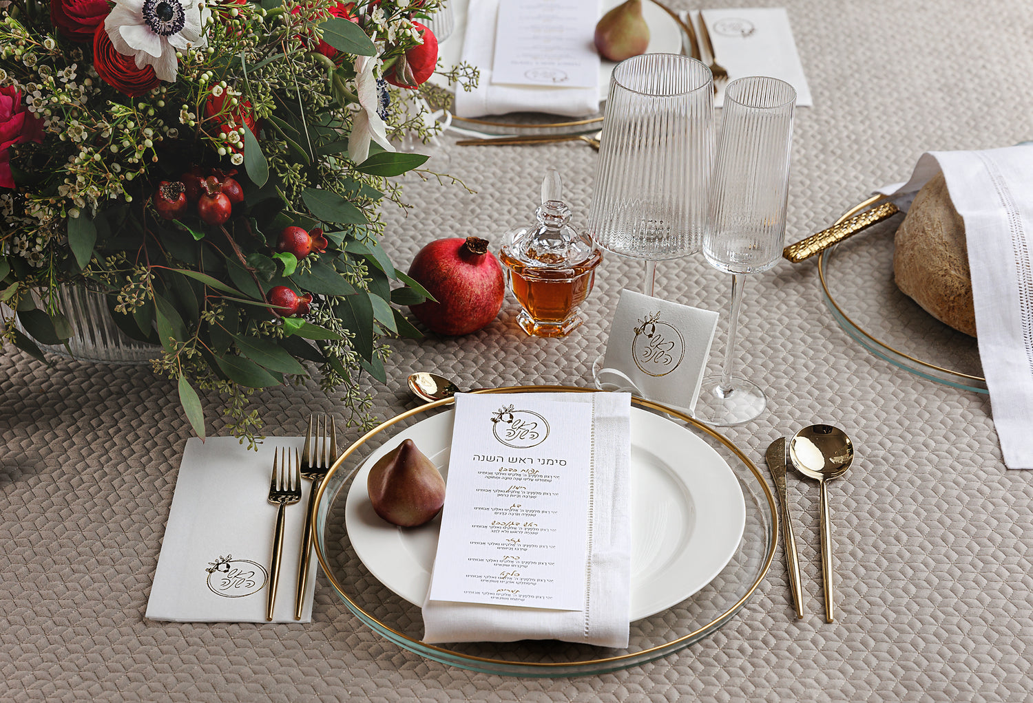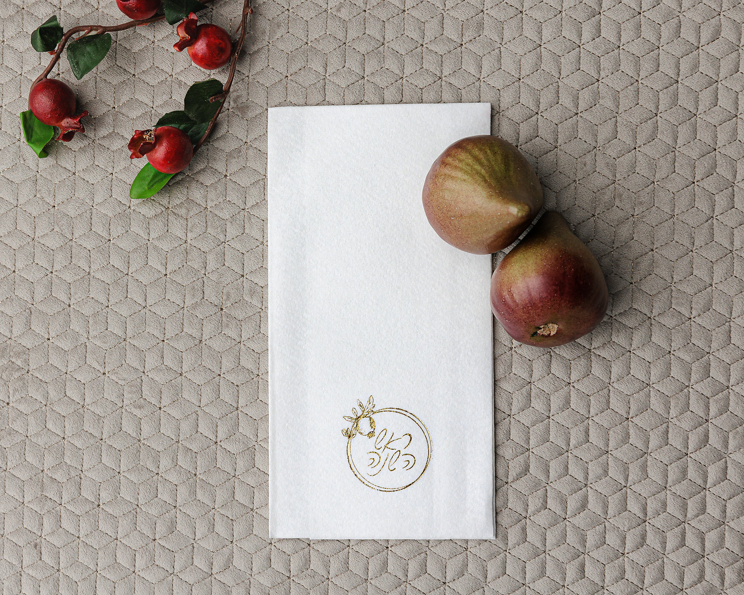 Coordinating set of Simanim Cards, Guest Towels, Shana Tova Pouches with a choice of gold or silver metallic foil stamp.