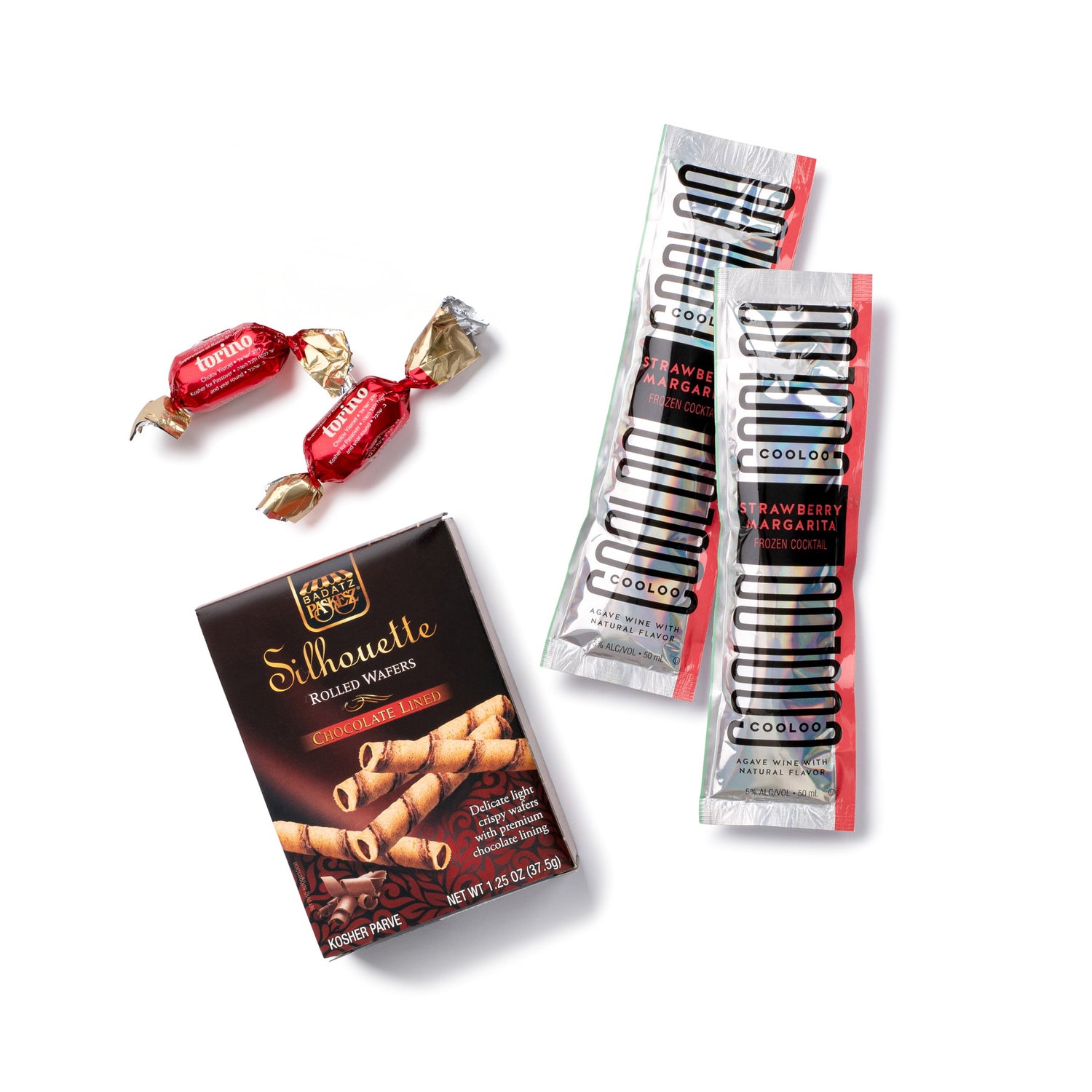 - Includes: 2 CooLoo alcoholic pops, 2 Torino milk chocolates, Silhouettes wafer roll