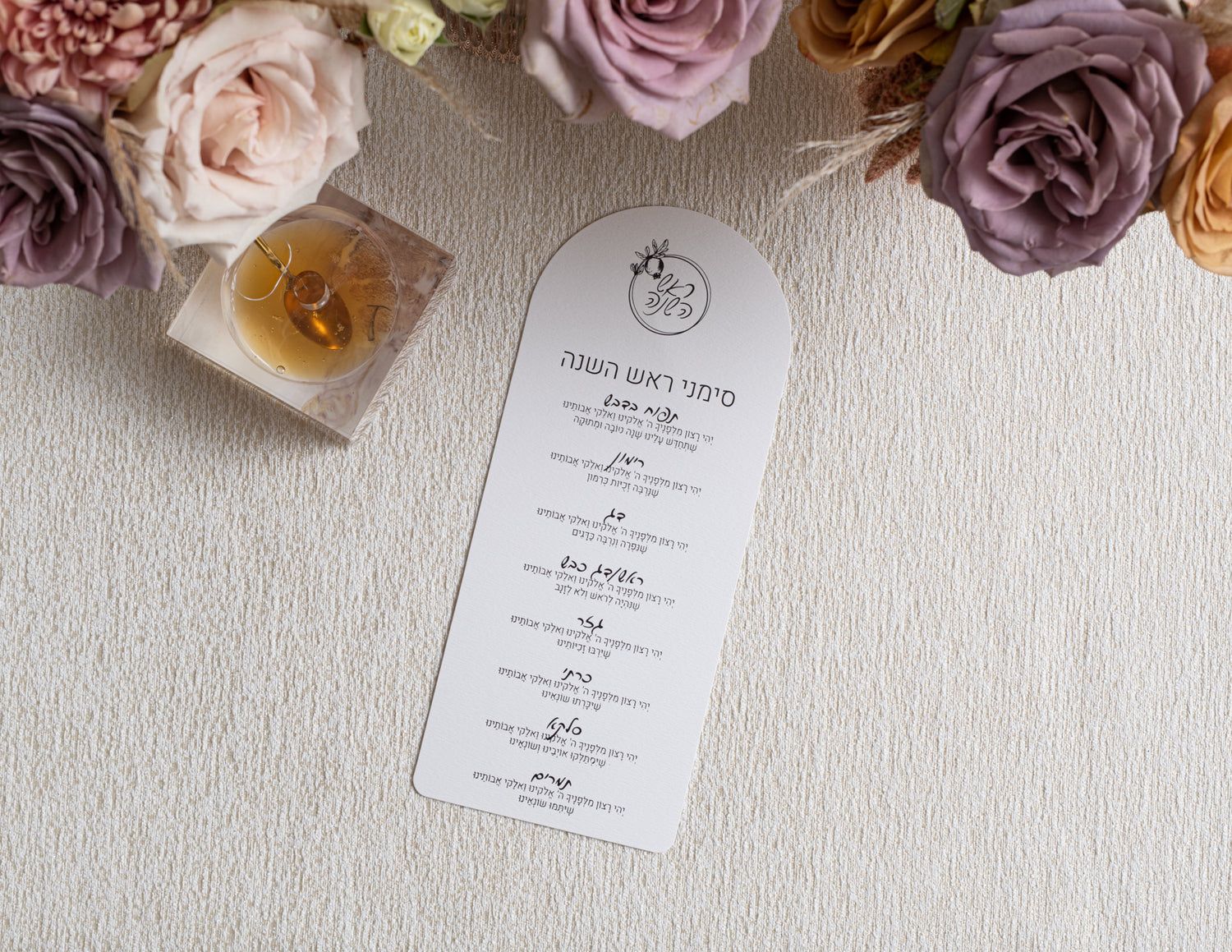 Linen textured Simanim Cards with a foil stamp for all those seated around the table.