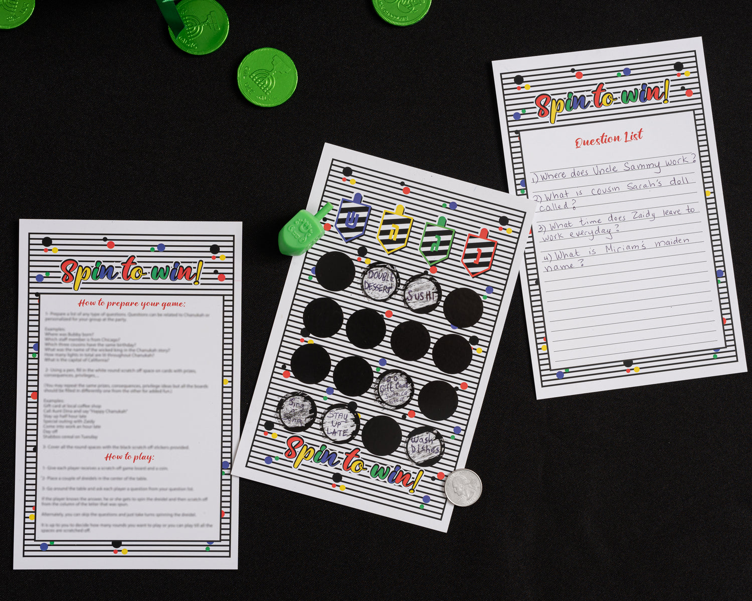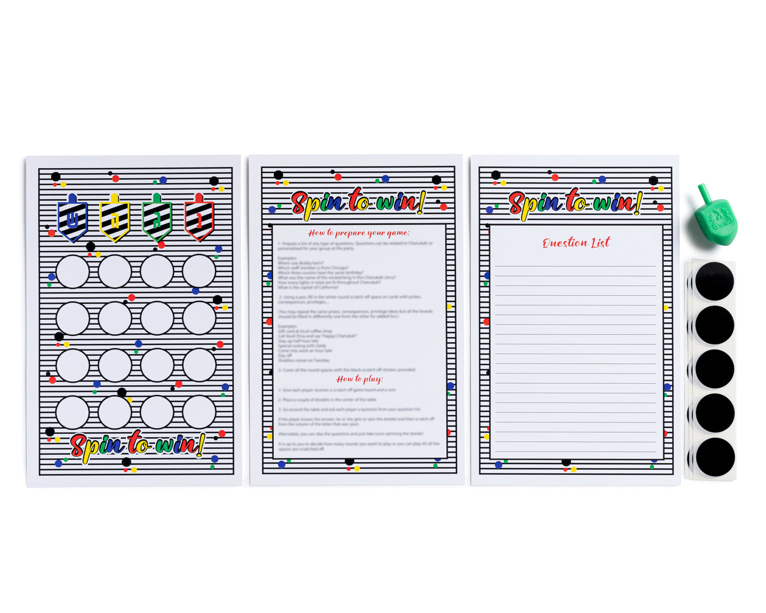 - The game includes: instructions, dreidel, scratch-off stickers (Silver or Black), and game boards