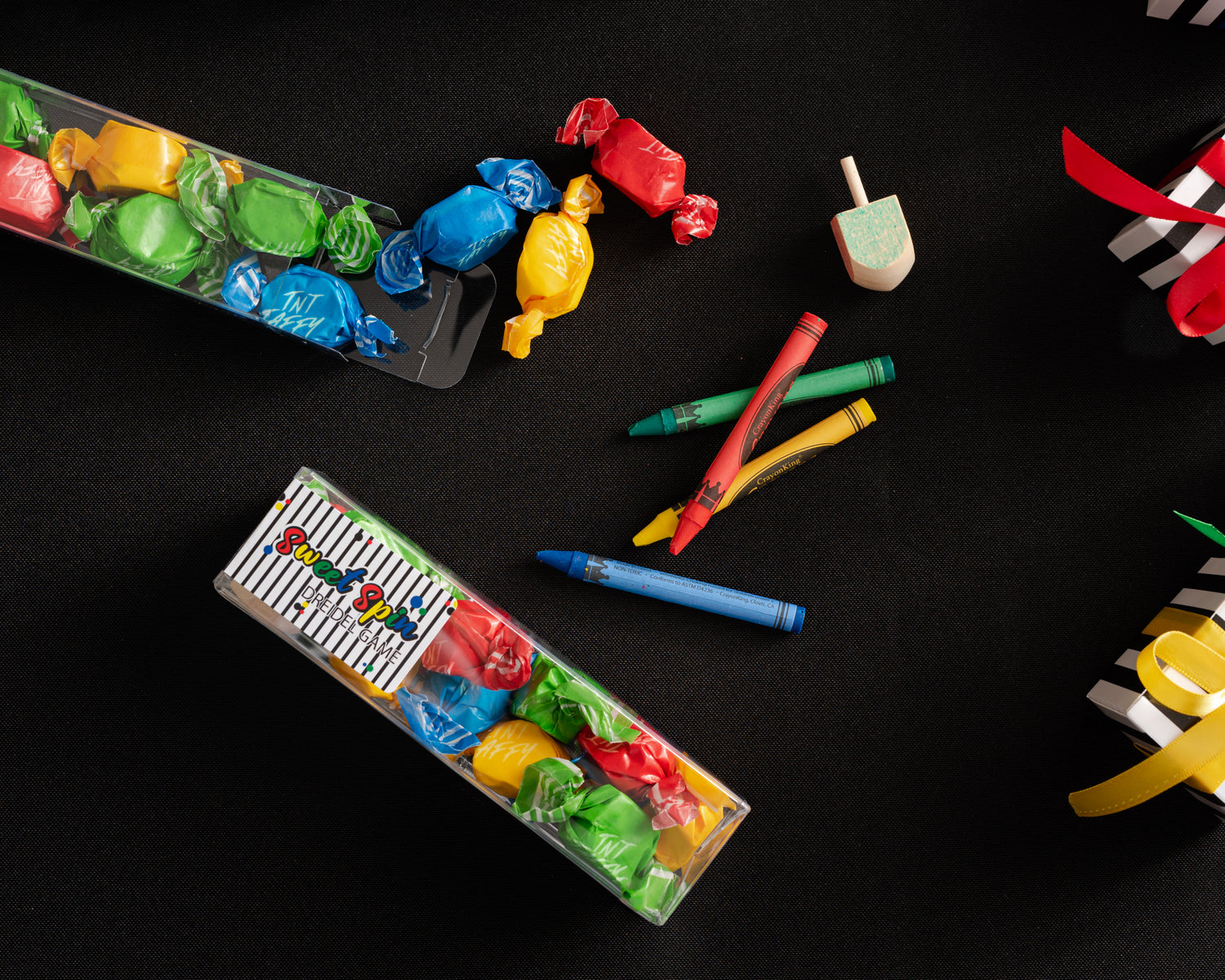 Dreidels and taffies for the young ones and those young at heart! A lively fun game in the Chanukah spirit. A new “spin” on the dreidel game. Sure to amuse them all!!