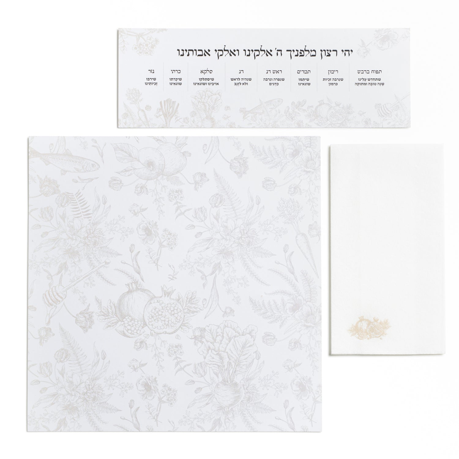 Toile set of Chargers, Simanim Cards, and Napkins bring elegance with the Rosh Hashana vibe to your table.