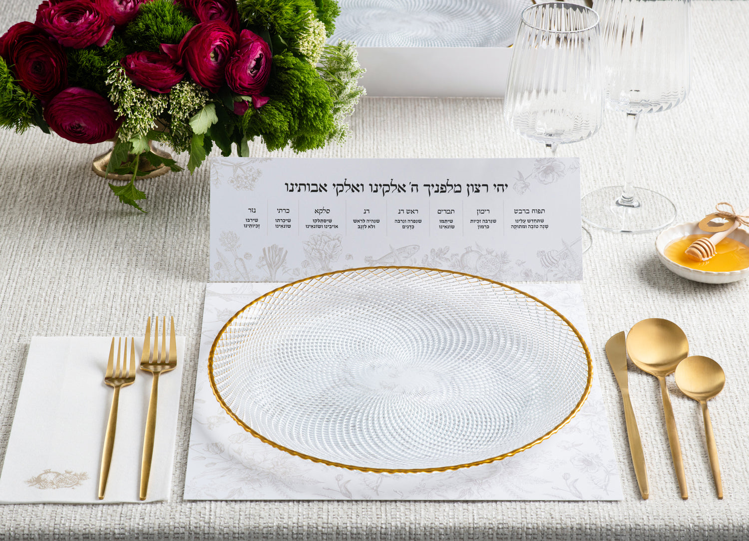 - Set includes: 4 Chargers & 4 Simanim Cards & 4 Napkins